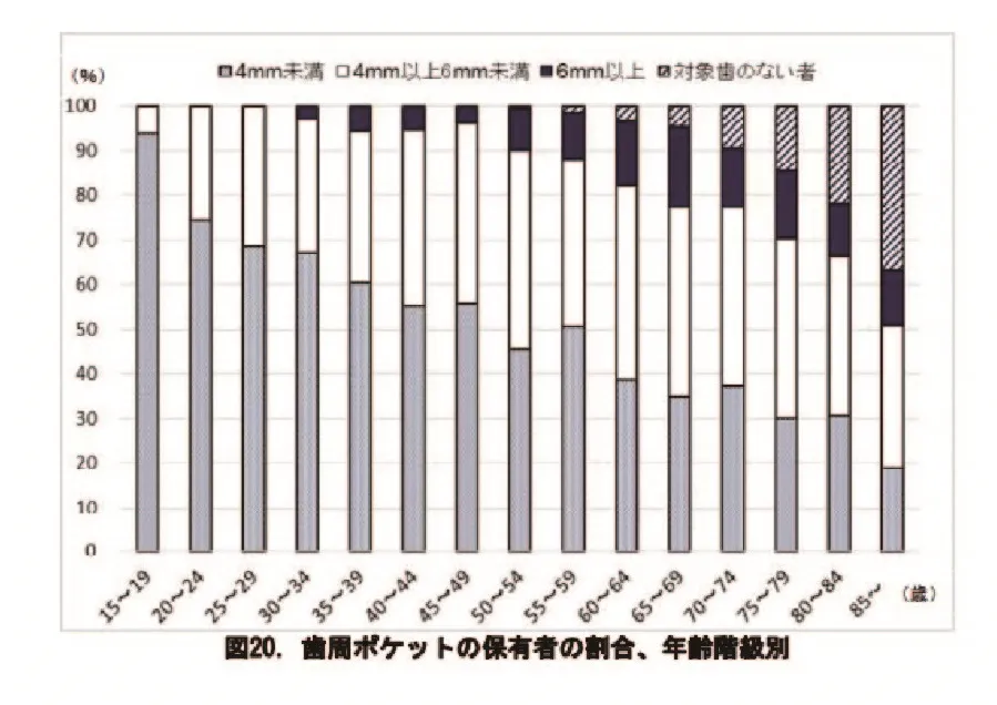この統計から日本国民の25歳から64歳までの年齢で国民のむし歯経験者数はほぼ100%という状況です。そして、治療をして年を取ると失う歯の本数が増えるという図式は、現在も変わっていません。すなわち、国民の口腔の健康状態は、良好とはいえない状況です。